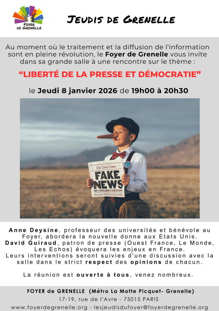 Jeudi 8 janvier à 19h – Jeudis de Grenelle ” Liberté de la presse et démocratie”