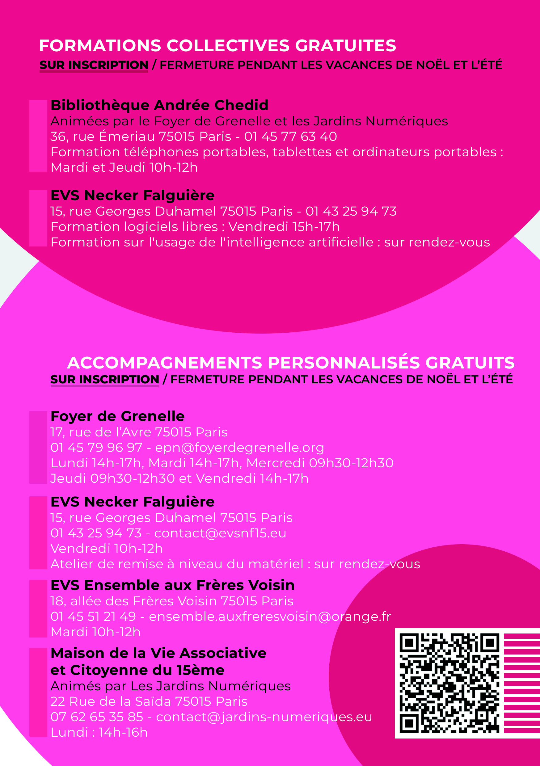 Quatre fois par semaine (lundi après-midi, mardi après-midi, mercredi matin et jeudi matin) sur inscription, une équipe de bénévoles vous accompagnent dans vos démarches sur l’ordinateur, et proposent également une formation en informatique pour les débutants. L’accompagnement est dans tous les cas individuel.