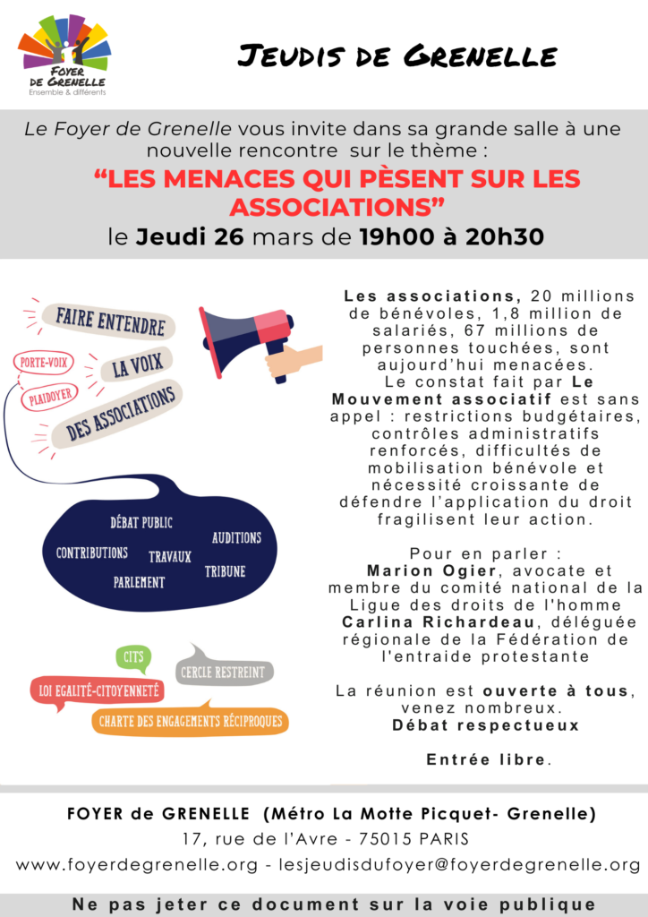 Jeudi 26 mars à 19h – Jeudis de Grenelle “Les menaces qui pèsent sur les associations”